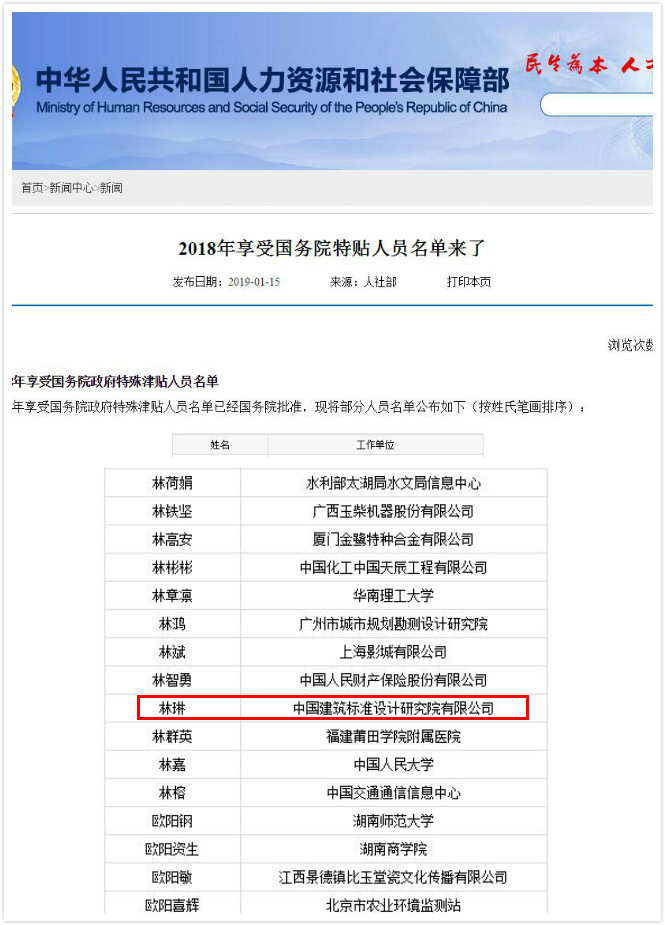 近日,人社部發(fā)布了《人力資源社會保障部關于公布2018年享受政府特殊津貼人員名單的通知》(人社部發(fā)﹝2019﹞11號),經(jīng)國務院批準,中國建筑標準設計研究院副總建筑師林琳入選2018年度享受政府特殊津貼人員名單。