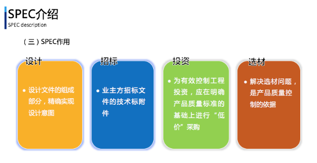 建筑產(chǎn)品技術(shù)規(guī)格說明書(Specification,簡稱SPEC)源自外資/港資背景顧問公司在配合業(yè)主進行項目建造總承包商招標時提交的技術(shù)文件,明確了投標方的工作界面和服務內(nèi)容,通常包括工程簡介、招標范圍、技術(shù)要求、規(guī)范標準、設(shè)備清單、企業(yè)資質(zhì)證明、產(chǎn)品檢驗報告及施工驗收要求等,但形式、內(nèi)容也會根據(jù)工程實際要求繁簡不一。SPEC為業(yè)主的總包合同編制提供了依據(jù)。