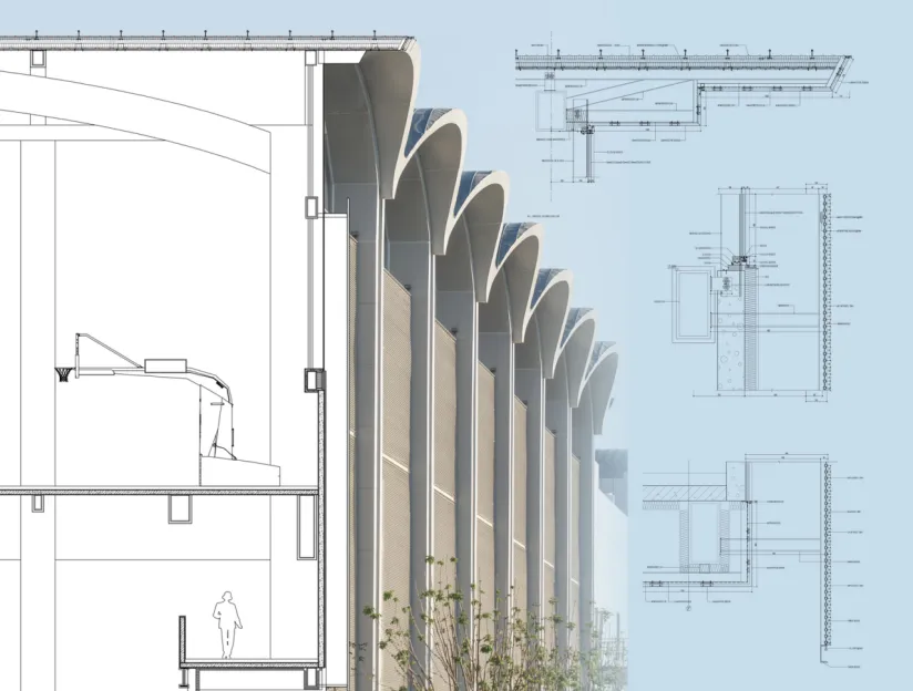 項目自設(shè)計到竣工落地僅一年時間,在此過程中,裝配式應(yīng)用效能顯著。輕型金屬拱形屋面的運用,不僅結(jié)構(gòu)穩(wěn)固、承載力強,而且安裝快捷、易于維護,有效降低了建筑整體重量,同時賦予了建筑獨特的視覺美感。